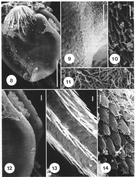 Figs. 8-14. Scanning electron micrographs of Echinobothrium megacanthum n. sp. Fig. 8. Scolex. Fig. 9. Edge of bothridium showing transition from filiform microtriches on distal surface (right) to palmate microtriches on proximal surface (left). Fig. 10. Filiform microtriches on distal surface of bothridia. Fig. 11. Meshlike branching filaments on anterior median region of bothridium, distal surface. Fig. 12. Bothridia showing views of roximal and distal surfaces. Fig. 13. Cephalic peduncle surface showing rows of spines. Fig. 14. Palmate microtriches on proximal surface of bothridium. Scale bars 100 µm (fig. 8), 10 µm (Figs. 9, 12, 13) and 1 µm (Figs. 10, 11, 14).