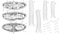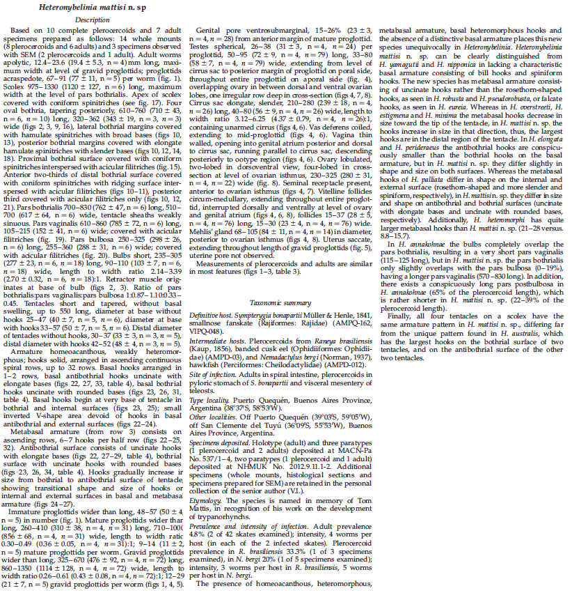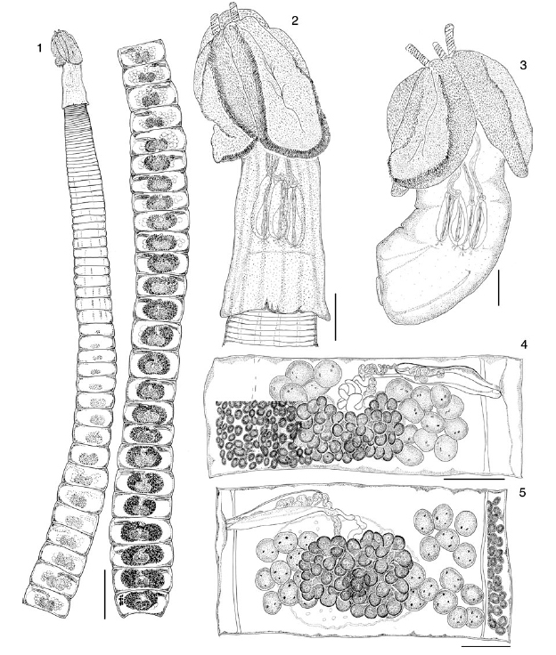 Figs 1–5. Heteronybelinia mattisi n. sp.: 1, entire worm, circum-medullar vitelline follicles not drawn to allow the view of internal organs (scale bar = 1 mm); 2, scolex of adult worm (scale bar = 20... MoreFigs 1–5. Heteronybelinia mattisi n. sp.: 1, entire worm, circum-medullar vitelline follicles not drawn to allow the view of internal organs (scale bar = 1 mm); 2, scolex of adult worm (scale bar = 200µm); 3, plerocercoid (scale bar ¼ 200µm); 4, mature proglottid, dorsal view, circum-medullar vitelline follicles partially drawn (scale bar = 150µm); 5, gravid proglottid, ventral view, circum-medullar vitelline follicles partially drawn (scale bar = 150µm). |