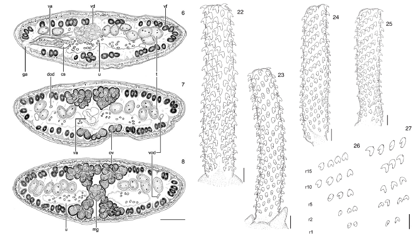 at level of the ovary, anterior to ovarian isthmus; 8, at level of Mehlis’ gland, posterior to ovarian isthmus. cs, Cirrus sac; ga, genital atrium; dod, osmoregulatory duct; mg, Mehlis’ gland; ov, ovary; t, testis; u, uterus; va, vagina; vd, vas deferens; vf, vitelline follicles; vod, ventral osmoregulatory duct. Figs 22–27. Heteronybelinia mattisi n. sp., tentacular armature. 22, Antibothrial surface of the tentacle, plerocercoid (scale bar = 25 µm); 23, bothrial surface of the tentacle, plerocercoid (scale bar = 25µm); 24, external surface of tentacle, plerocercoid (scale bar = 25µm); 25, internal surface of the tentacle, plerocercoid (scale bar = 25 µm). 26–27, Profiles of hooks of basal and metabasal
