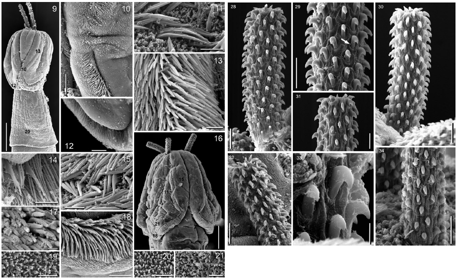 (scale bar = 10 µm); 15, proximal bothrial surface, plerocercoid (scale bar = 3 µm); 16, lateral view of the scolex, plerocercoid (scale bar = 150µm), small numbers indicate locations of details shown in figs 11, 15, 18 and 21; 17, apex of scolex, plerocercoid (scale bar = 1 µm); 18, hamulate spinitriches in the posterior margin of bothria, plerocercoid (scale bar = 15µm); 19, pars vaginalis, plerocercoid (scale bar = 2µm); 20, surface of pars bulbosa, adult (scale bar = 1.5µm); 21, distal bothrial surface near posterior margin of bothria,