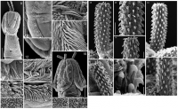 armature of Heteronybelinia mattisi n. sp. (scale bar = 20µm): 26, bothrial surface, uncinate hooks with rounded bases; 27, antibothrial surface, uncinate hooks with elongate bases. r1, row 1; r2, row 2; r5, row 5; r10, row 10; r15, row 15. |