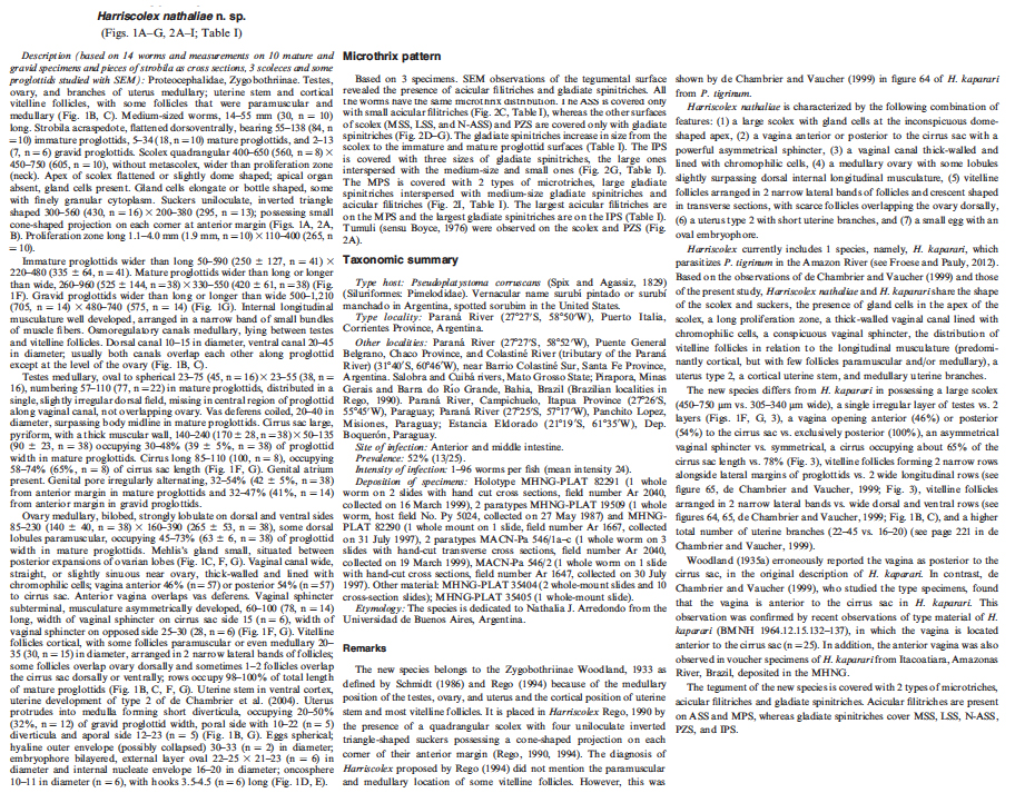 FIGURE 1. Harriscolex nathaliae n. sp. from Pseudoplatystoma corruscans. (A) Scolex, dorsoventral view (holotype MHNG-PLAT 82291). (B) Transverse cross section of mature proglottid at level of testes ... MoreFIGURE 1. Harriscolex nathaliae n. sp. from Pseudoplatystoma corruscans. (A) Scolex, dorsoventral view (holotype MHNG-PLAT 82291). (B) Transverse cross section of mature proglottid at level of testes posterior to cirrus sac (holotype MHNG-PLAT 82291). (C) Transverse cross section of mature proglottid at the level of the ovary (holotype MHNG-PLAT 82291). (D, E) Detail of eggs (MHNG-PLAT 22917, host field No. Py 5076). (F) Mature proglottid, dorsal view (paratype MHNG-PLAT 82290, field number Ar 1667). (G) Gravid proglottid, ventral view (holotype MHNG-PLAT 82291). Abbreviations: cp, cone-shaped projection; cs, cirrus sac; doc, dorsal osmoregulatory canal; em, embryophore; ga, genital atrium; gc, gland cells;