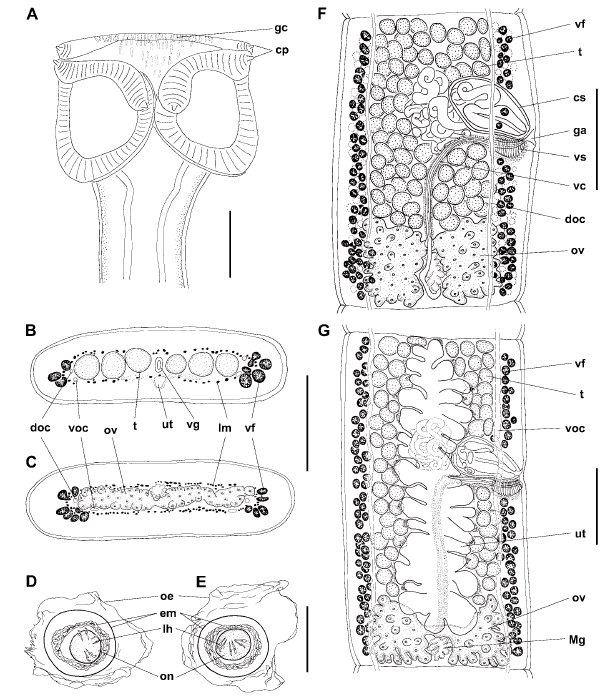 lh, larval hooks; lm, longitudinal musculature; Mg, Mehlis’s gland; oe, outer envelope; on, oncosphere; ov, ovary; t, testes; ut, uterus; vc, vaginal canal; vf, vitelline follicles; voc, ventral osmoregulatory canal; vs, vaginal sphincter. Scale bars: A, F, G = 250 µm; B, C = 200 µm; D, E = 20 µm. |