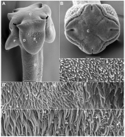 FIGURE 2. Scanning electron micrographs of Harriscolex nathaliae n. sp. (A) Latero-dorsoventral view of scolex; letters indicate location of high-magnification sections shown in C–I. (B) Apical view o... MoreFIGURE 2. Scanning electron micrographs of Harriscolex nathaliae n. sp. (A) Latero-dorsoventral view of scolex; letters indicate location of high-magnification sections shown in C–I. (B) Apical view of scolex. (C) Apical surface of scolex. (D) Marginal surface of sucker. (E) Luminal surface of sucker. (F) Nonadherent surface of sucker. (G) Proliferation zone surface. (H) Immature proglottid surface. (I) Mature proglottid surface. Filled black arrow shows cone-shaped projections; filled white arrow shows aciculate filitriches; empty white arrow shows small gladiate spinitriches; dashed arrow shows large gladiate spinitriches. Scale bars: A, B = 100 µm; C–I = 1 µm. |