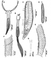 Fig. 13 Line drawings of Dollfusiella parva n. sp. from Himantura gerrardi (Gray) (BO-23) in the South China Sea (A, D–G) and from Himantura cf. gerrardi 2 (BO-138) in the Celebes Sea (B, C). A, compl... MoreFig. 13 Line drawings of Dollfusiella parva n. sp. from Himantura gerrardi (Gray) (BO-23) in the South China Sea (A, D–G) and from Himantura cf. gerrardi 2 (BO-138) in the Celebes Sea (B, C). A, complete specimen (immature), lateral view; B, complete specimen, dorso-ventral view; C, mature segment; D, bulb; E, basal tentacular armature, external surface; F, metabasal tentacular armature,