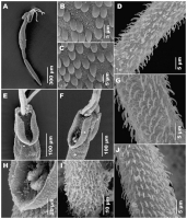 complete specimen, lateral view; B, palmate spinitriches covering proximal bothrial surface; C, enlarged, palmate spinitriches covering scolex peduncle; D, metabasal tentacular armature, antibothrial surface; E, anterior part of scolex, dorso-ventral view; F, anterior part of scolex, dorso-ventral to lateral view; G, metabasal tentacular armature, external surface; H, detailed view of posterior bothrial margin— note enlarged, capilliform filitriches lining border between distal and proximal bothrial surfaces; I, basal tentacular armature, bothrial surface; J, metabasal tentacular armature, bothrial surface. Symbols: *, position on proximal bothrial surface where microthrix