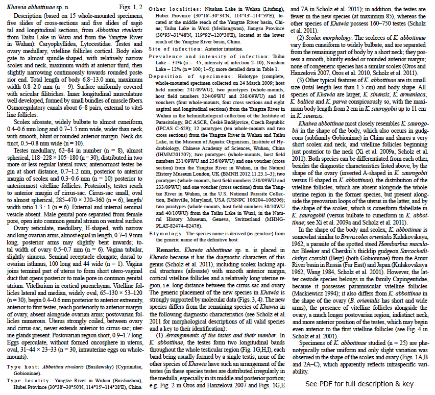 | Type Material | Holotype (complete, whole-mounted specimen collected on 24 March 2009; host field number 241/09WU), 2 paratypes (whole-mounts, host field numbers 224/09WU and 238/09WU) in the helminthological collection of the Institute of Parasitology, BC ASCR, Českι Budějovice, Czech Republic (IPCAS C-629); 12 paratypes (10 whole-mounts and 2 cross sections) from the Yangtze River in Wuhan and Taihu Lake, in the Museum of Aquatic Organisms, Institute of Hydrobiology, Chinese Academy of Sciences, Wuhan, China (IHMM201207); 2 paratypes (whole-mounts, host field numbers 231/09WU and 236/09WU) from the Yangtze River in Wuhan, in the Natural History Museum London, UK (BMNH 2012.11.23.13); 2 paratypes (whole-mounts, host field numbers 230/09WU and 233/09WU) from the Yangtze River in Wuhan in the U.S. National Parasite Collection, Beltsville, Maryland, USA (USNPC 106204106206); 2 paratypes (whole-mounts, host field numbers 38/10WU and 40/10WU) from the Taihu Lake in Wuxi, in the Natural History Museum, Geneva, Switzerland (MHNGPLAT- 8247482476). |