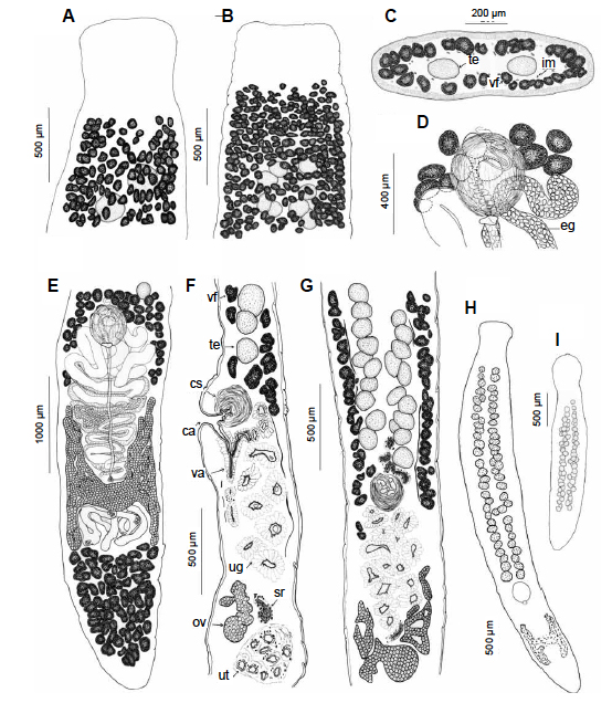 note common genital atrium; G longitudinal section of uterine region; note testes in two longitudinal rows and uterine glands, only lateral vitelline follicles visible; H outline of mature specimen with two rows of testes, cirrus-sac and ovary; I outline of immature specimen with two rows of testes. Abbreviations: ca common genital atrium; cs cirrus-sac; eg eggs; im inner longitudinal musculature; ov ovary; sr seminal receptacle; te testes; ug uterine glands; ut uterus; va vagina; vf vitelline follicles.