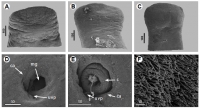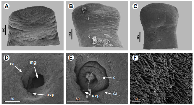 Fig. 2. Khawia abbottinae sp. n. from Abbottina rivularis in China. Scanning electron micrographs (SEM). AC scolices; D, E genital pores; F acicular filitriches from the middle part of the body. Abbreviations: c cirrus; ca common genital atrium; mg male gonopore; uvp uterovaginal pore.