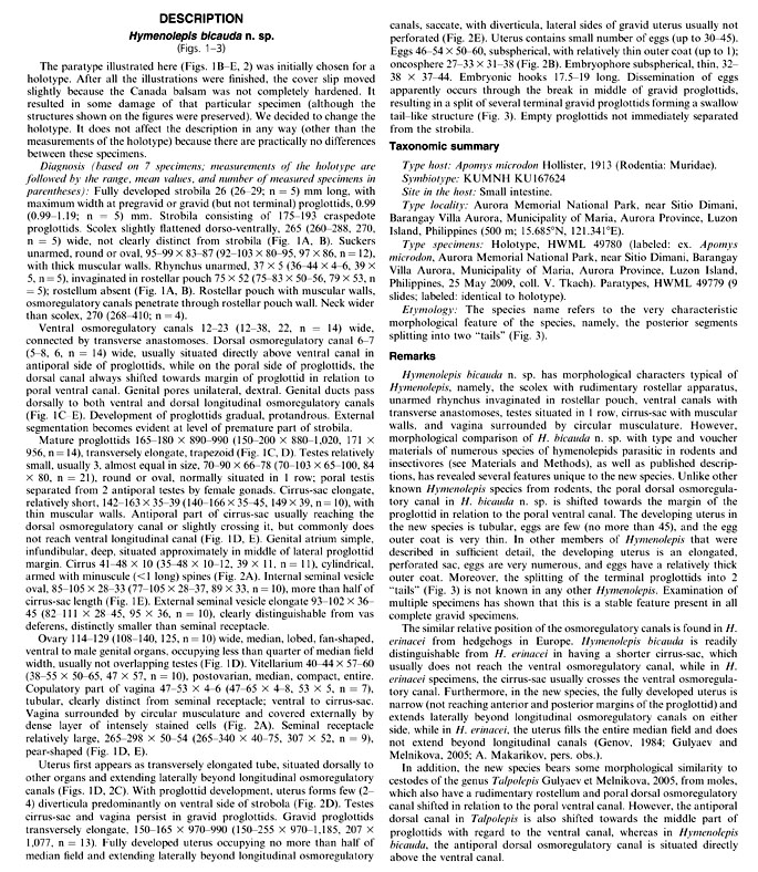 Makarikov, A.A., V.V. Tkach, and S.E. Bush. 2013. Two new species of Hymenolepis (Cestoda: Hymenolepididae) from murid rodents (Rodentia: Muridae) in the Philippines. Journal of Parasitology 99(5): 847–855.