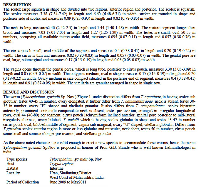 Figure 1. Tylocephalum govindi sp. nov. (Cestoda-Lecanicephalidae) in Trygon sephen, from Uran, Sinddhudurg Distric (M.S) India.