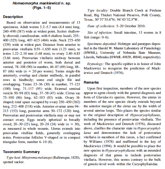 Dutton, H. R. and M. A. Barger. 2014. A new genus and species of caryophyllaeid (Cestode: Caryophyllidea) from spotted suckers, Minytrema melanops (Catostomidae), in the Big Thicket National Preserve, Texas, U.S.A.. Comparative Parasitology 81(1): 23-26. (6283) Download PDF |