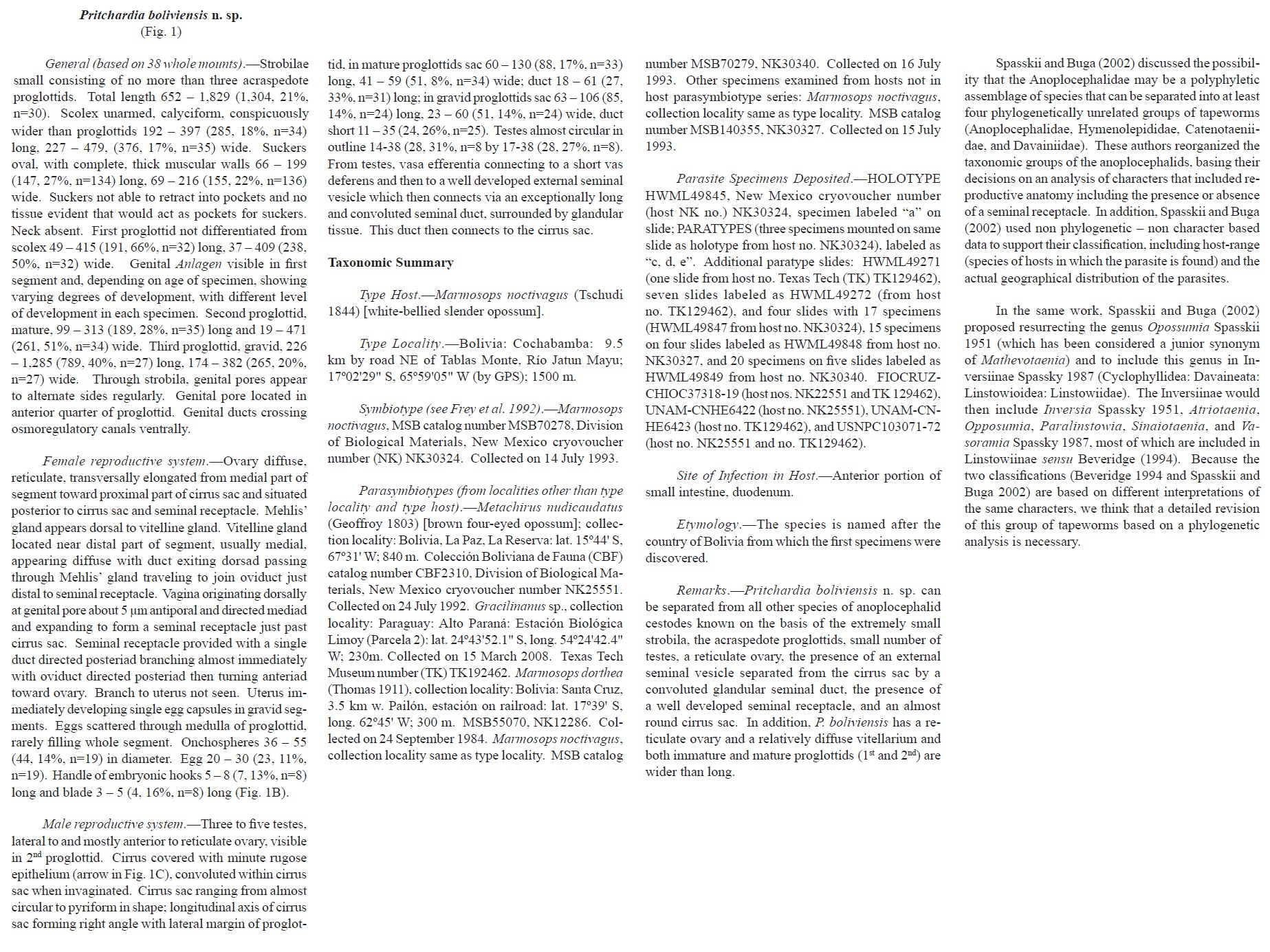 Gardner, S. L., F. Agustín Jiménez, and M. L. Campbell. 2013. Pritchardia boliviensis n. gen., n. sp. (Anoplocephalidae: Linstowinae), a Tapeworm from Opossums (Didelphidae) in the Yungas and Lowlands of Bolivia and Atlantic Forest of Paraguay. Occasional Papers, Museum of Texas Tech University 319: 1-18.