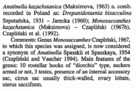 | Synonyms | Drepanidotaenia bisacculina Szpotańska, 1931 - Jarecka (1960); Monosaccanthes kazachstanica (Maksimova) - Czapliński (1967b), Czapliński et al. (1992) |