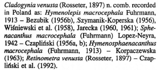| Synonyms | Hymenolepis macrocephala Fuhrmann, 1913 - Bezubik (1956b), Szymanik-Koperska (1956), Wisniewski et al. (1958), Jarecka (1960, 1961); Sphenacanthus macrocephala (Fuhrmann) Lopez-Neyra, 1942 - Czaplinski (1956a, b); Hymenosphaenacanthus macrrocephala (Fuhrmann, 1913) - Korpaczewska (1963); Retinometra venustta (Rosseter, 1897) - Czaplinski et al. (1992). |