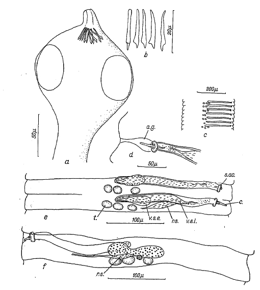 Fig. 1. Monosaccanthes streperae sp. n. a -- scolex; b -- rostellar hooks; c -- young "male" proglottid with variable number and arrangement of testes; d -- genital atrium with protruded cirrs; e -- young "male" proglottids with typical arrangement of the three testes, seminal vesicles and seminal receptacle filled with sperm; f -- hermaphrodite proglottid