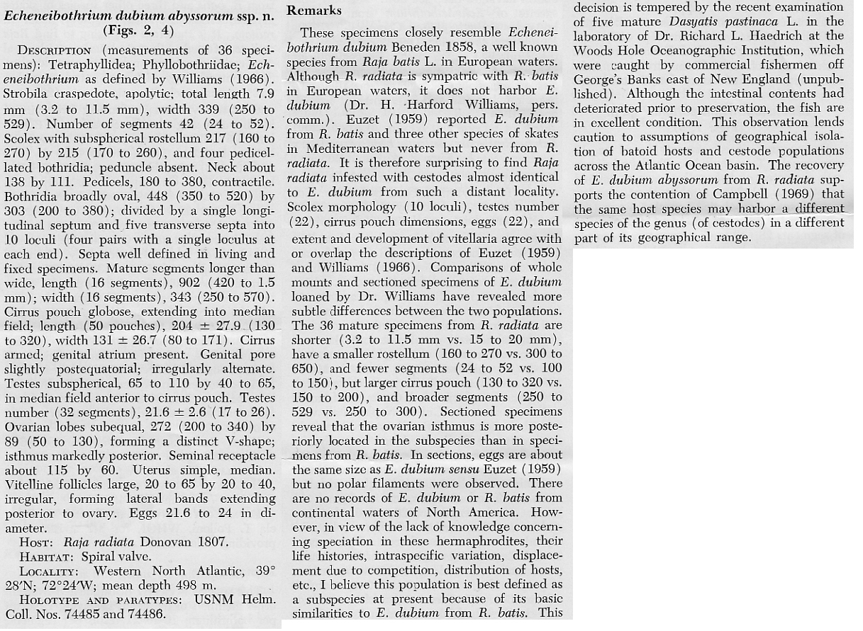 | Scientific Name Notes | This was originally described as the subspecies Echeneibothrium dubium abyssorum. We are recognizing it at the species level here. |