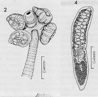 Fig 2., Scolex of E. dubium abyssorum. Fig 4., Mature segment of E. dubium abyssorum