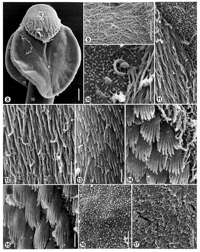 Fig.17. Surface of mature proglottid. Scale bars: Fig. 8 = 25 µm; Figs. 9, 11, 12 = 2 µm; Figs. 10, 13-17 = 1 µm