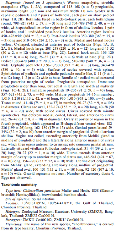 Purivirojkul, W. and B. Boonsoong. 2012. A New Species of Tetraphyllidean (Onchobothriidae) Cestode from the Brown- Banded Bambooshark Chiloscyllium punctatum (Elasmobranchii: Hemiscylliidae). Journal of Parasitology 98(6): 1216-1219. (6340) Download PDF |