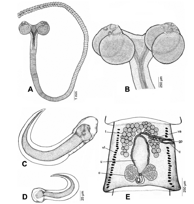 Yorkeria chonburiensis n. sp. (line drawing). (A) Whole worm. (B) Scolex. (C) Medial hook. (D) Lateral hook. (E) Mature proglottid. (c = cirrus; gp = genital pore; o = ovary; t = testis; va = vagina; vf = vitelline follicle; u = uterus).