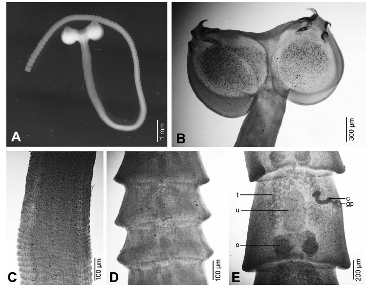 Yorkeria chonburiensis n. sp. (A) Fresh sample. (B) Scolex. (C) Immature proglottid. (D) Immature proglottid. (E) Mature proglottid. (c = cirrus; o = ovary; t = testis; u = uterus).