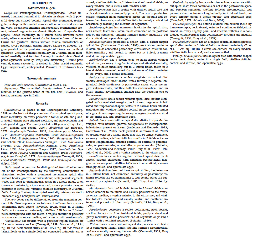 Gil de Pertierra, A. A. and L. G. Semenas. 2005. Galaxitaenia toloi n. gen., n. sp. (Eucestoda: Pseudophyllidea) from Galaxias platei (pisces: Osmeriformes, Galaxiidae), in the Patagonian region of Argentina. Journal of Parasitology 91(4): 900-908. (6359) Download PDF |
