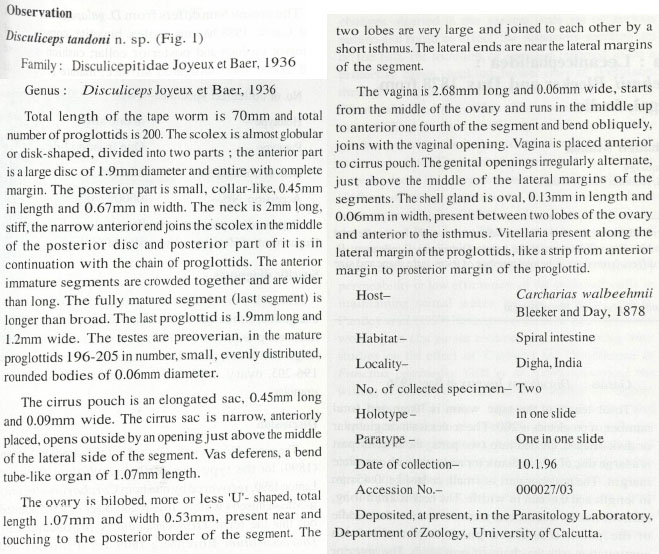 Pramanik, P.B. and B. Manna. 2005. Disculiceps tandoni new species (Cestoda: Lecanicephalidea: Disculicepitidae) from Carcharias walbeehmii Bleeker and Day 1878 from Bay of Bengal at Digha c. Proceedings of the Zoological Society 58(2): 121-125. (6406) Download PDF |