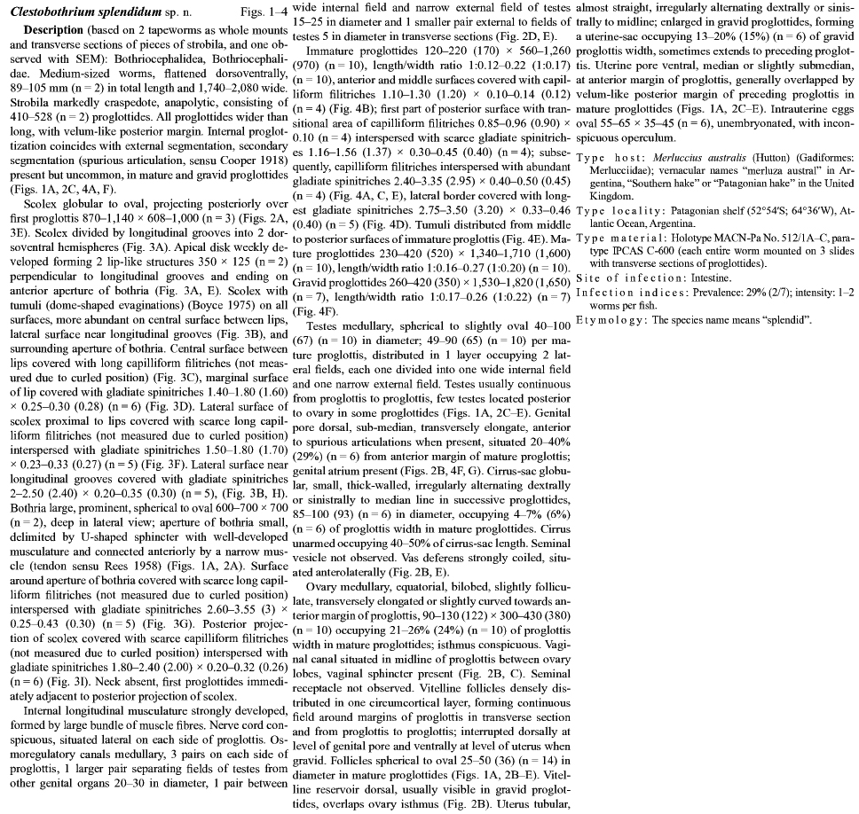 Gil de Pertierra, A., I. S. Incorvaia, and N. J. Arredondo. 2011. Two new species of Clestobothrium (Cestoda: Bothriocephalidea), parasites of Merluccius australis and M. hubbsi (Gadiformes: Merlucciidae) from the Patagonian shelf of Argentina, with comments on Clestobothrium crassiceps (Rudolphi, 1819). Folia Parasitologica 58(2): 121-134.
