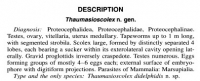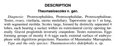 Cañeda-Guzmán, I. C., A. de Chambrier, and T. Scholz. 2001. Thaumasioscolex didelphidis n. gen., n. sp. (Eucestoda: Proteocphalidae) from the black-eared opossum Didelphis marsupialis from Mexico, the first proteocephalidean tapeworm from a mammal. Journal of Parasitology 87(3): 639-646. (3929) Download PDF |