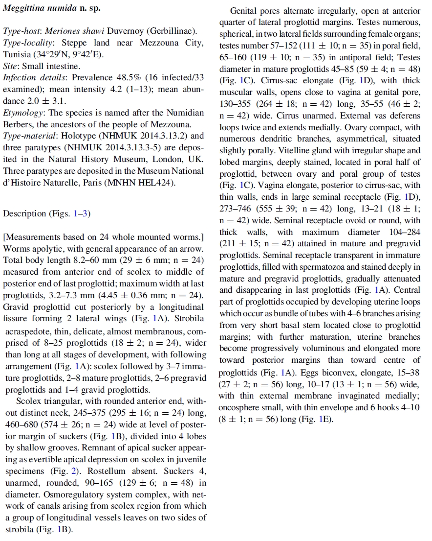 Jrijer, J and L. Neifar. 2014. Meggittina numida n. sp. (Cyclophyllidea: Catenotaeniidae), a parasite of the Shaw’s jird Meriones shawi (Duvernoy) (Rodentia: Gerbillinae) in Tunisia. Systematic Parasitology 88: 167–174.