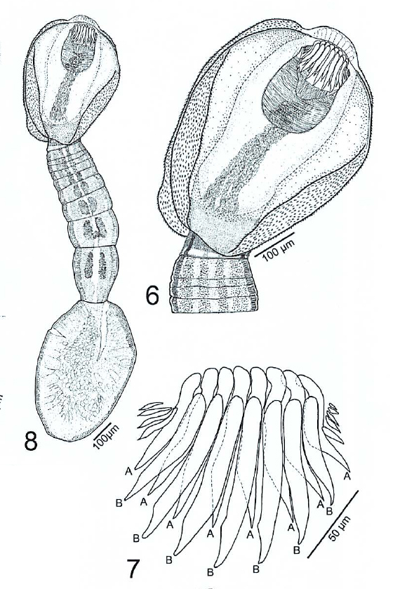 (6-8) Echinobothrium marquesi n. sp. (6) Scolex (holotype SAMCTA 61825). (7) Apical hooks and lateral hooklets (paratype USNPC 107915). (8) Whole immature worm (holotype SAMCTA 61825).