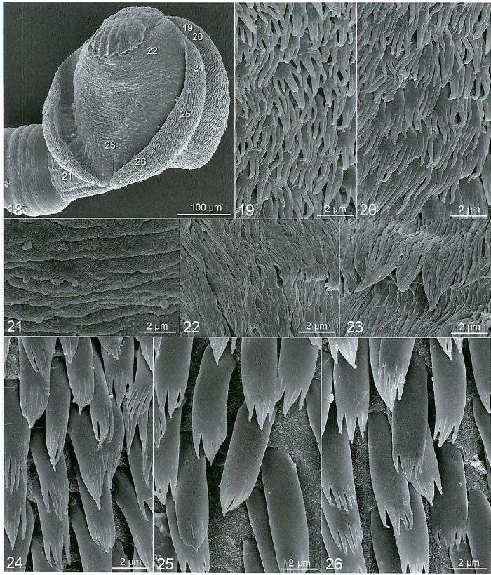 Figures 18-26. Scanning electron micrographs of Echinobothrium marquesi n. sp. (18) Scolex; small white numbers correspond to Figs. 19-26. (19) Detail of anteriormost proximal surface. (20) Detail of proximal surface directly below 19. (21) Detail of cephalic peduncle surface. (22) Detail of anterior region of distal bothrial surface. (23) Detail of posterior region of distal bothrial surface. (24) Detail of proximal surface posterior to 20. (25) Detail of middle proximal surface. (26) Detail of posterior proximal surface.