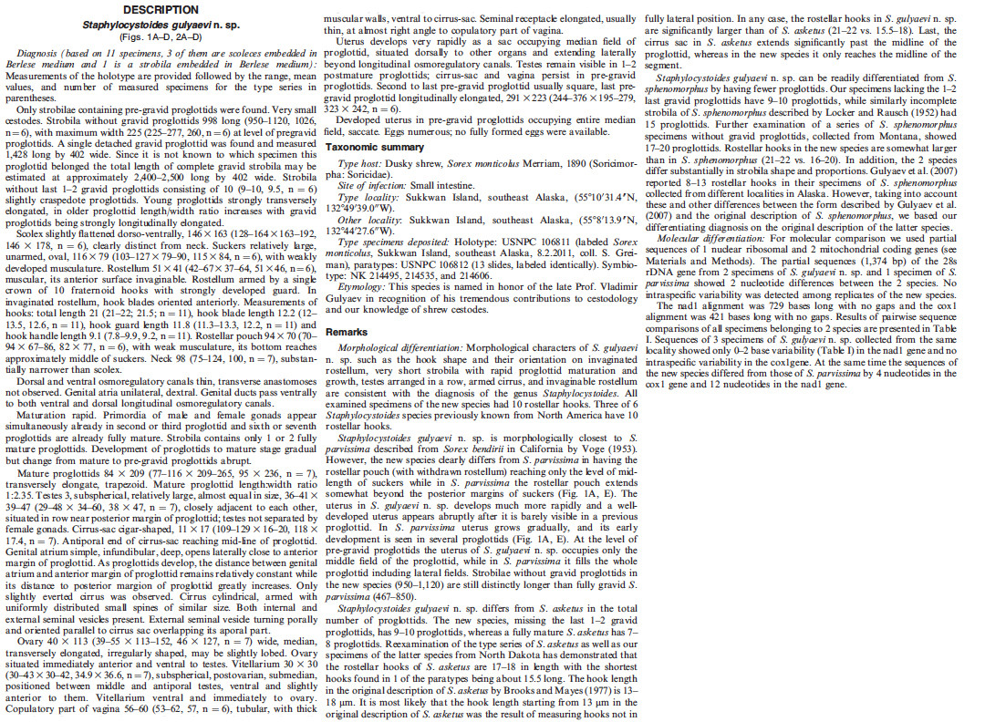 FIGURE 1. Staphylocystoides gulyaevi n. sp. and Staphylocystoides parvissima (A) Total view of the holotype of Staphylocystoides gulyaevi n. sp. (B)