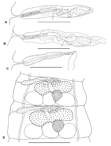 FIGURE 2. (A) Cirrus sac and vagina of the holotype of Staphylocystoides gulyaevi n. sp. (B) Cirrus sac and vagina of a paratype of Staphylocystoides gulyaevi n. sp. (C) Vagina of the holotype of Staphylocystoides