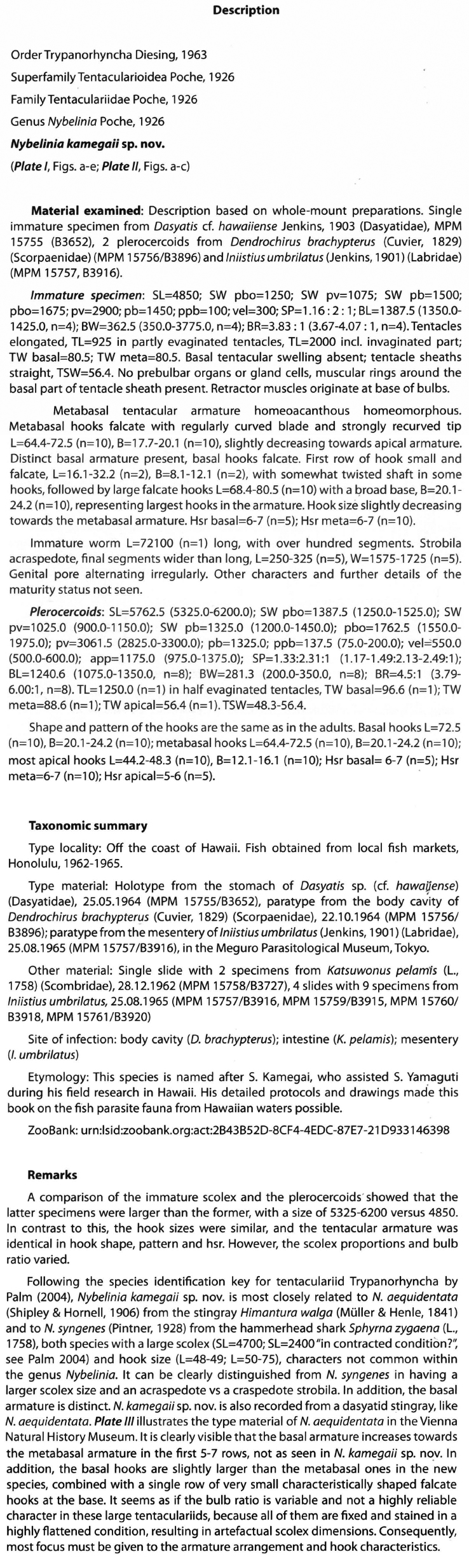 | Type Material | Holotype from the stomach of Dasyatis sp. (cf. hawaiiense) (Dasyatidae), 25.05.1964 (MPM 15755/83652), paratype from the body cavity of Dendrochirus brachypterus (Cuvier, 1829) (Scorpaenidae), 22.10.1964 (MPM 15756/83896); paratype from the mesentery of lniistius umbrilatus (Jenkins, 1901) (Labridae), 25.08.1965 (MPM 15757/83916), in the Meguro Parasitological Museum, Tokyo. |