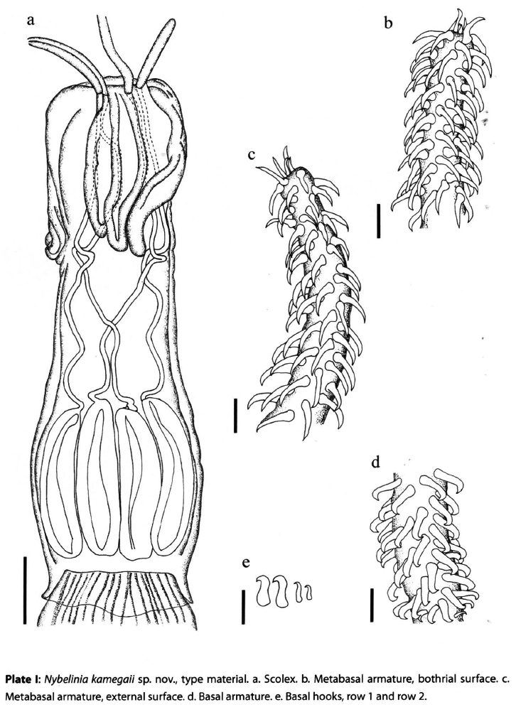 Plate 1: Nybelinia kamegaii sp. nov., type material. a. Scolex. b. Metabasal armature, bothria I surface. c. Metabasal armature, external surface. d. Basal armature. e. Basal hooks, row 1 and row 2.