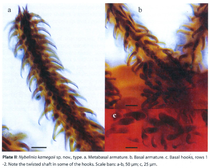 Plate II: Nybelinia kamegaii sp. nov., type. a. Metabasal armature. b. Basal armature. c. Basal hooks, rows 1-2. Note the twisted shaft in some of the hooks. Scale bars: a-b, 50 µm; c, 25 µm.