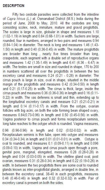 Humbe, A., S. N.Borde, and S. Jadhav. 2012. A report of new mammalian tapeworm Moniezia osmanabadensis from Capra hircus at Osmanabad district (M.S.) India. Journal of Experimental Sciences 3: 8-10. (6430) |