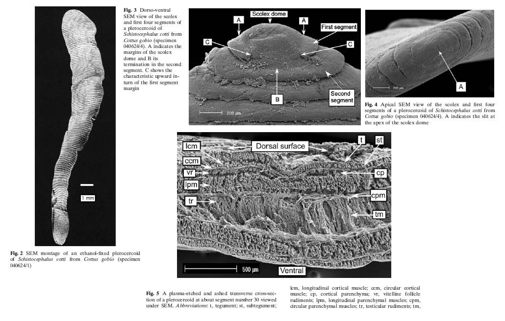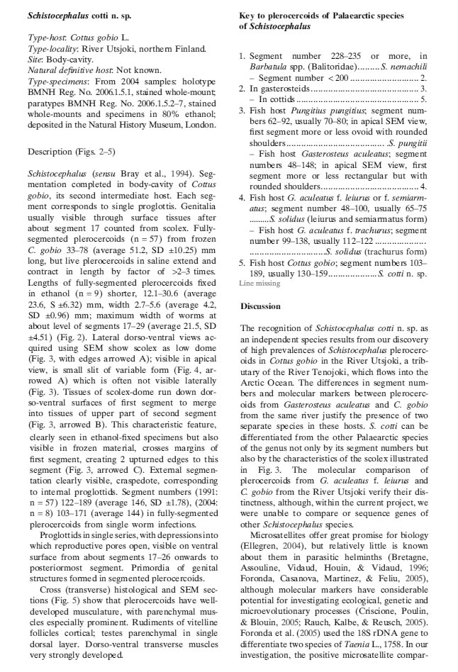 Chubb, J. C., T. Seppälä, A. Lüscher, M. Milinski, M., and E. T. Valtonen. 2006. Schistocephalus cotti n. sp. (Cestoda: Pseudophyllidea) plerocercoids from bullheads Cottus gobio L. in an Arctic river in Finland, with a key to the plerocercoids of the Palaearctic species of the genus. Systematic Parasitology 65(2): 161-170. (6431) Download PDF |