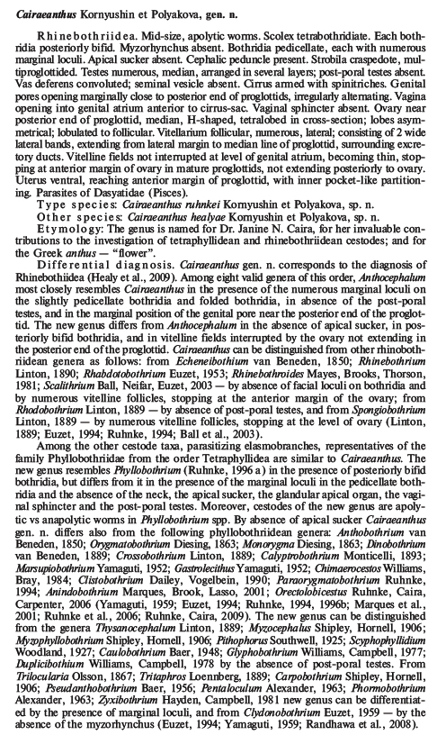 Kornyushin, V. V. and T. A. Polyakova. 2012. Cairaeanthus gen. n. (Cestoda, Rhinebothriidea), with the Description of Two New Species from Dasyatis pastinaca in the Black Sea and the Sea of Azov. Vestnik zoologii 46(4): e-1—e-18. (6432) Download PDF |
