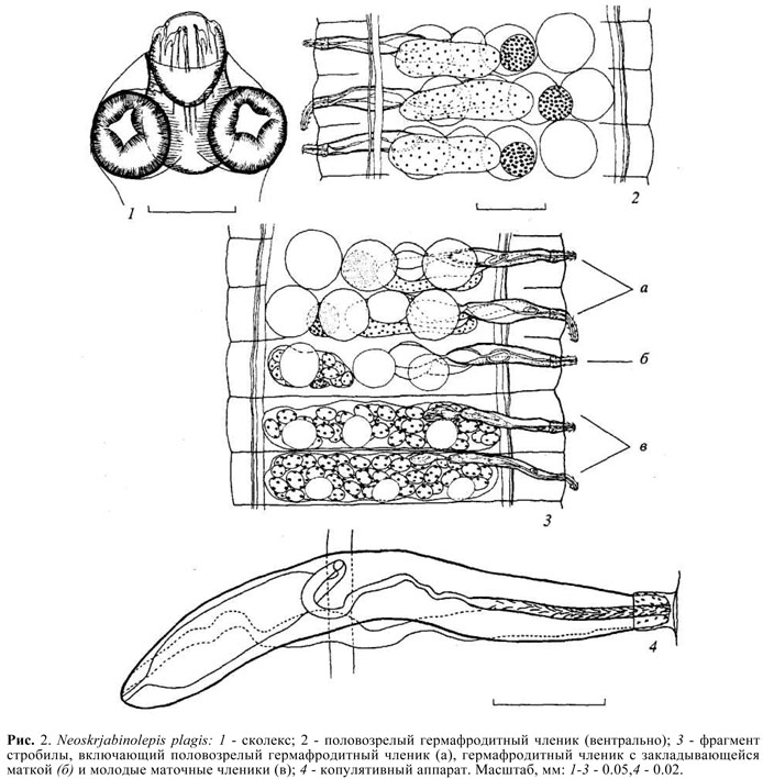 Figure 1. 1- scolex; 2 - hermaphroditic mature proglottids (ventral view); 3 - fragment of strobila included hermaphroditic mature proglottids (a), postmature proglottids (b) and pregravid proglottids... MoreFigure 1. 1- scolex; 2 - hermaphroditic mature proglottids (ventral view); 3 - fragment of strobila included hermaphroditic mature proglottids (a), postmature proglottids (b) and pregravid proglottids; 4 - genital ducts. Scale bars - 1-3 - 0.05 mm, 4 - 0.02 mm. |