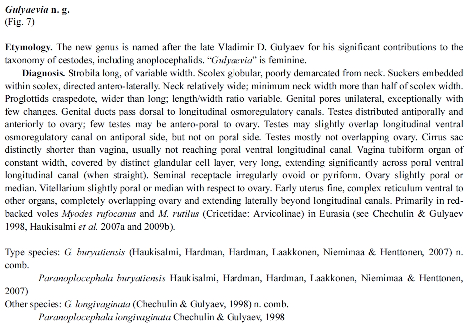 Chechulin, A. I. and V. D. Gulyaev. 1998. Paranoplocephala longivaginata sp. n. (Cyclophyllidea: Anoplocephalidae) - novaya cestoda ot gryzunov vostochnoj Sibiri. Parazitologiya 32: 352-356. (5104) Download PDFHaukisalmi, V., L. M.Hardman, E. P. Hoberg, and H. Henttonen. 2014. Phylogenetic relationships and taxonomic revision of Paranoplocephala Lühe, 1910 sensu lato (Cestoda, Cyclophyllidea, Anoplocephalidae). Zootaxa 3873: 371–415. (6451) Download PDF |