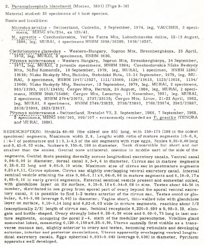 Moniez, R. 1891. Notes sur les helminthes. Especes nouvelles ou peu connues du genre Moniezia. Revue Biologique du Nord de la France 4: 65-79. (4746) Download PDFHaukisalmi, V., L. M.Hardman, E. P. Hoberg, and H. Henttonen. 2014. Phylogenetic relationships and taxonomic revision of Paranoplocephala Lühe, 1910 sensu lato (Cestoda, Cyclophyllidea, Anoplocephalidae). Zootaxa 3873: 371–415. (6451) Download PDF |