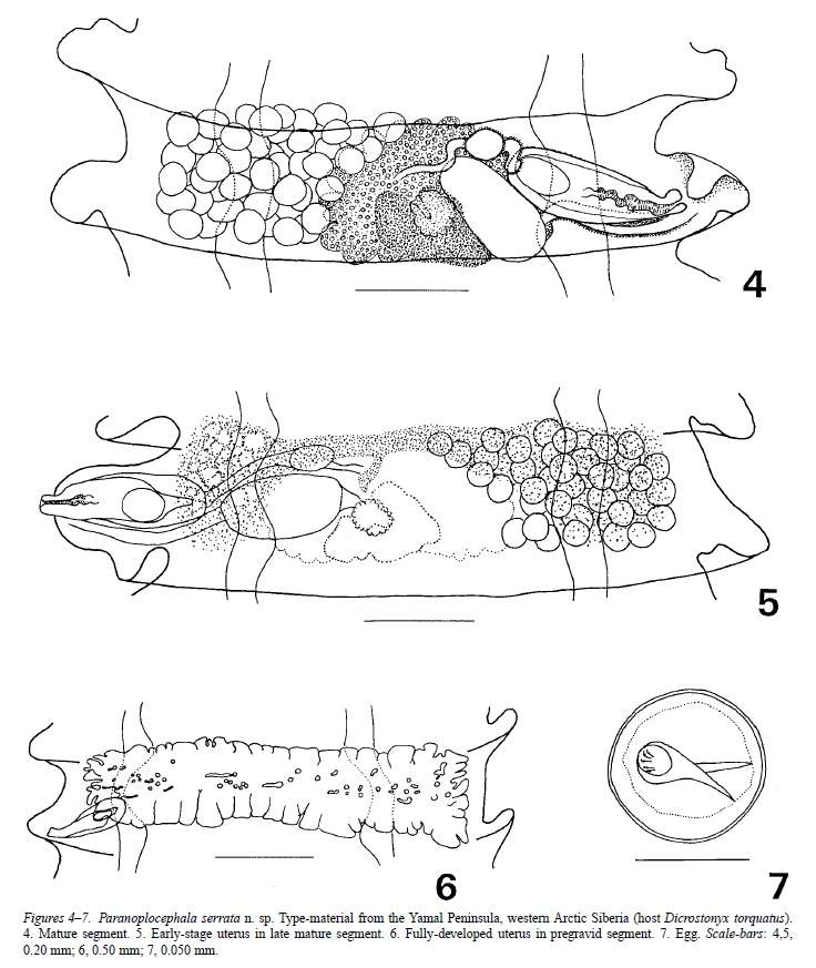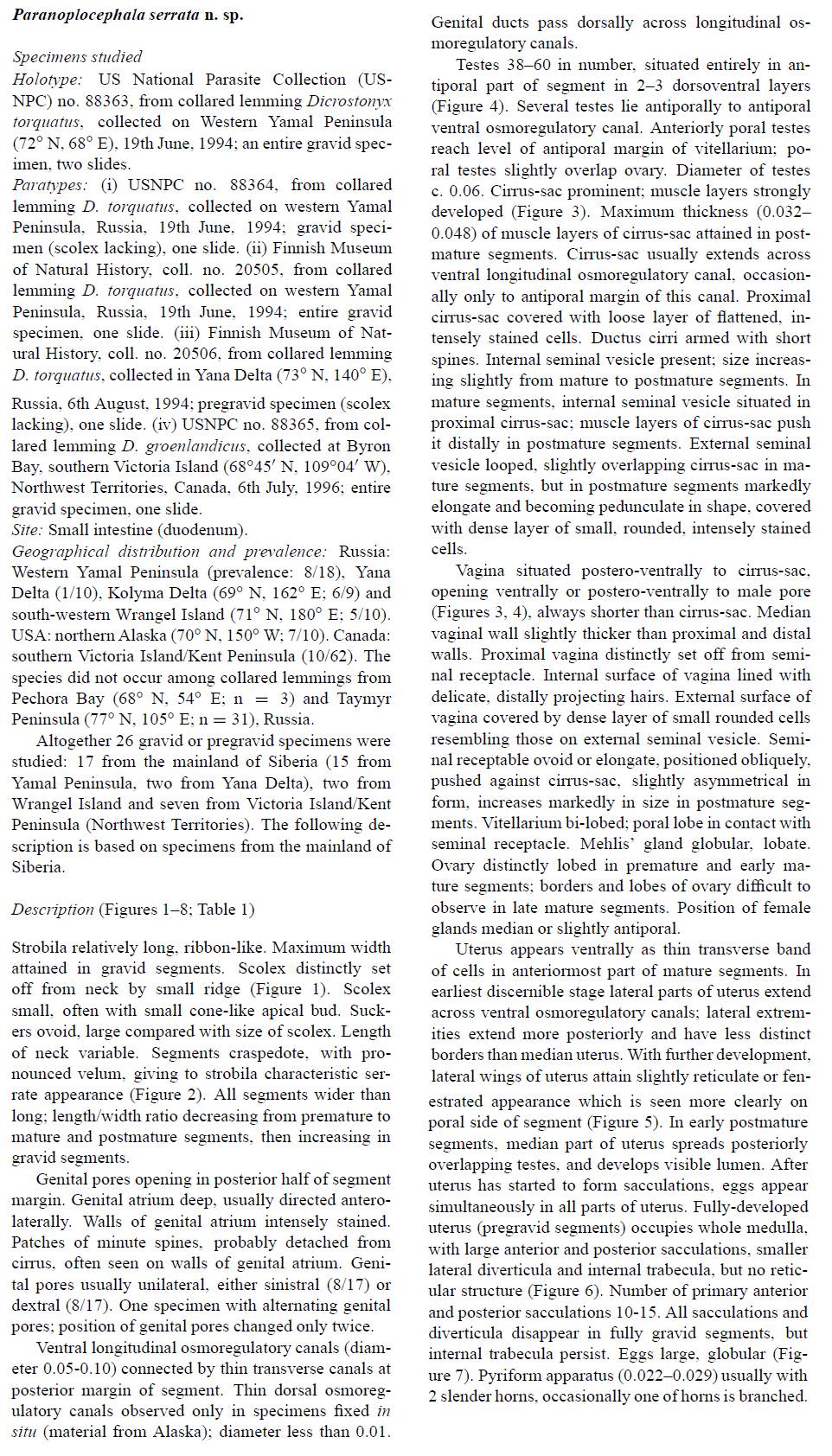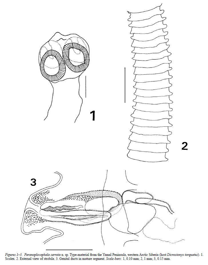 Haukisalmi, V. and H. Henttonen. 2000. Description and morphometric variability of Paranoplocephala serrata n. sp. (Cestoda: Anoplocephalidae) in collared lemmings (Dicrostonyx spp., Arvicolinae) from Arctic Siberia and North America. Systematic Parasitology 45: 219-231. (5057) Download PDFHaukisalmi, V., L. M.Hardman, E. P. Hoberg, and H. Henttonen. 2014. Phylogenetic relationships and taxonomic revision of Paranoplocephala Lühe, 1910 sensu lato (Cestoda, Cyclophyllidea, Anoplocephalidae). Zootaxa 3873: 371–415. (6451) Download PDF |