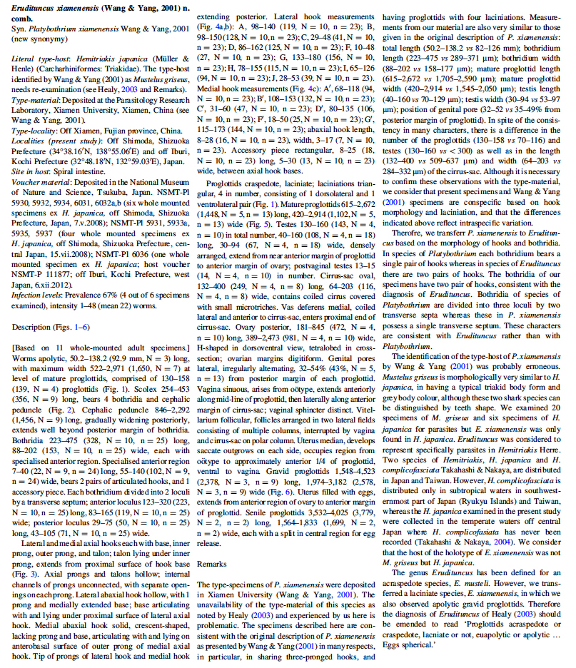 | Scientific Name Notes | While Wang and Yang (2001) reported Mustelus griseus as the type host, Kurashima et al. (2014) corrected the host identification to Hemitriakis japanica |