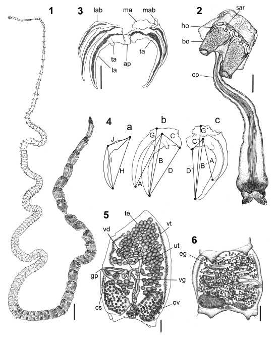 Figs. 1–6 Erudituncus xiamenensis. 1, Whole worm (NSMT-Pl 6031); 2, Scolex (NSMT-Pl 5930); 3, Hooks (NSMT-Pl 5930); 4, Hook measurements (a, lateral abaxial hook; b, lateral axial hook; c, medial axial hook); 5, Mature proglottid (NSMT-Pl 5931); 6, Gravid proglottid (NSMT-Pl 5932). Scale-bars: 1, 2 mm; 2, 150 µm; 3, 50 µm; 5, 200 µm; 6, 500 µm. Abbreviations: ap, accessory piece; bo, bothridium; cp, cephalic peduncle; cs, cirrus-sac; e.g., egg; gp, genital pore; ho, hook; la, lateral axial hook; lab, lateral abaxial hook; ma, medial axial hook; mab, medial abaxial hook; ov, ovary; sar, specialised anterior region; ta, talon; te, testes; ut, uterus; vd, vas deferens; vg, vagina; vt, vitellarium