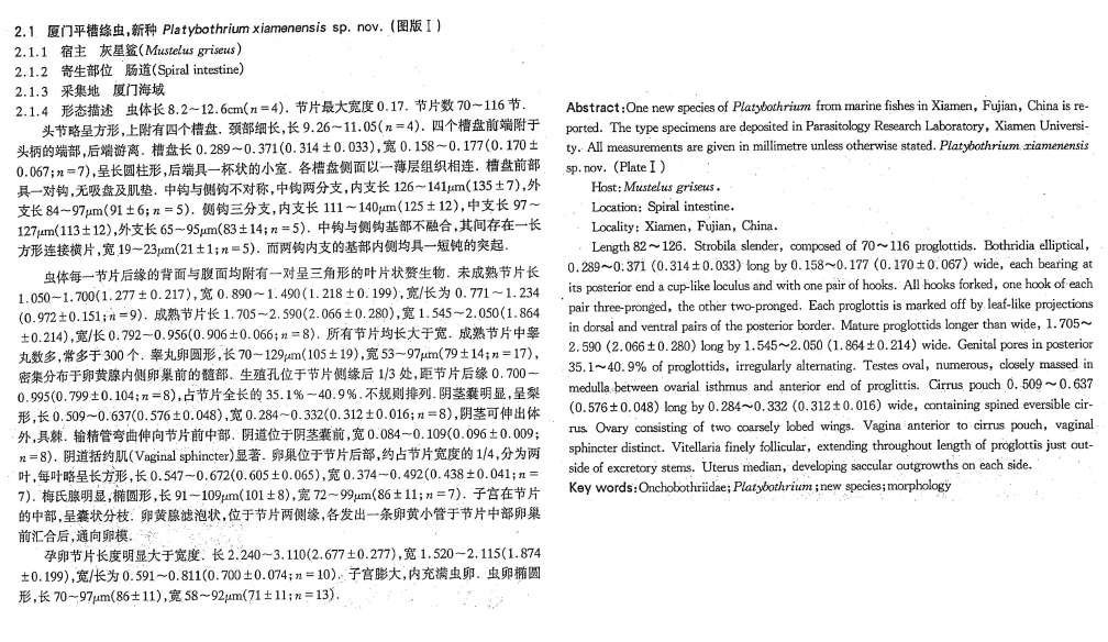Wang, Y. and W. Yang. 2001. One new species of Platybothrium from marine fishes in Xiamen, Fujian, China. . Journal of Oceanography in Taiwan Strait 20(2): 200-204. (3896) Download PDFKurashima, A., T. Shimizu, N. Mano, K. Ogawa, and T. Fujita. 2014. A new combination and a new species of onchobothriid tapeworm (Cestoda: Tetraphyllidea: Onchobothriidae) from triakid sharks. Systematic Parasitology 88: 75-83. (6457) Download PDF |