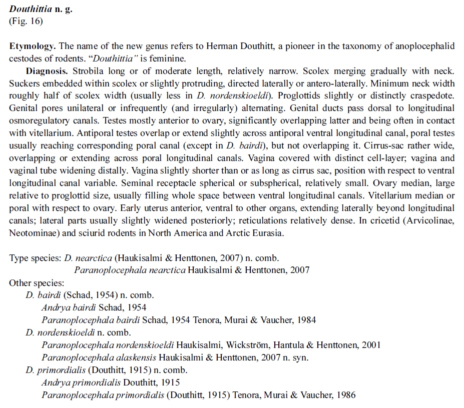 Douthitt, H. 1915. Studies on the cestode family Anoplocephalidae. Illinois Biological Monographs 1(3): 1-96. (4640) Download PDFHaukisalmi, V., L. M.Hardman, E. P. Hoberg, and H. Henttonen. 2014. Phylogenetic relationships and taxonomic revision of Paranoplocephala Lühe, 1910 sensu lato (Cestoda, Cyclophyllidea, Anoplocephalidae). Zootaxa 3873: 371–415. (6451) Download PDF |