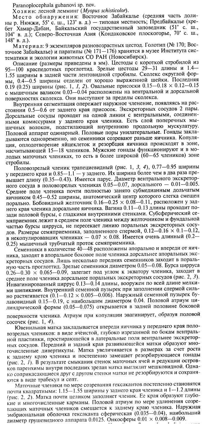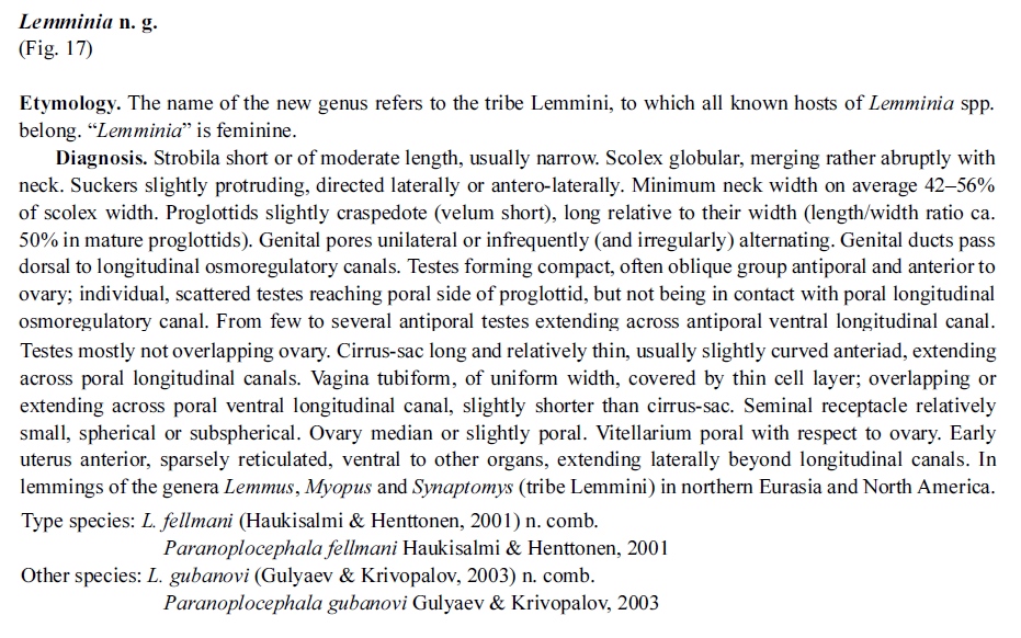 Gulyaev, V. D. and A. V. Krivopalov. 2003. Novyj vid cestody Paranoplocephala gubanovi sp. n. (Cyclophyllidea: Anoplocephalidae) ot lesnogo lemminga Myopus schisticolor vostochnoj Sibiri. Parazitologiya 37: 488-495. (5100) Download PDFHaukisalmi, V., L. M.Hardman, E. P. Hoberg, and H. Henttonen. 2014. Phylogenetic relationships and taxonomic revision of Paranoplocephala Lühe, 1910 sensu lato (Cestoda, Cyclophyllidea, Anoplocephalidae). Zootaxa 3873: 371–415. (6451) Download PDF |